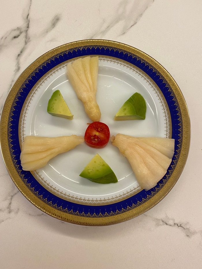 當阿富師端出壽司蛋糕,又是另一個大驚喜!這是鳳亭在母親節推出的創意散壽司,光用看的就食指大動,帶光澤的醋飯混入鮪魚泥、海苔,醋飯上擺放當季的頂級食材,包括挪威鮭魚、日本青魽、鮪魚、黃魚、大干貝、刺身級牡丹蝦等,點綴以有蔬菜界LV之稱的鑽石冰花,搭配以蝦卵+特調醬為topping的當令綠竹筍,色香味型俱全,讓特殊節慶多了一個美味又有創意的新選擇。