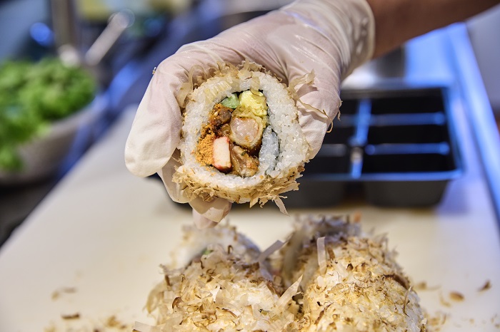 元祿壽司使用鰻魚、炸蝦為主材料,捲成肥厚的花壽司後,灑上滿滿的柴魚,用料豐富,美味可口。