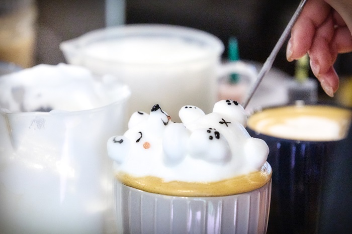 有著高超拉花技術的拉花師是曉安,擁有日本咖啡藝術雕花講師證照。她透露,3D拉花的關鍵在奶泡,不管是牛奶還是奶粉,比例越單純,打出來的奶泡越好,圖案也能支撐比較久。