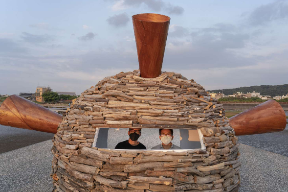 《世界放大器》藝術家Michael Vincent Manalo來自菲律賓,來台逾10年,首度到訪新竹市創作。他說,第一次至賞蟹步道場勘,走到步道盡頭時,感受彷彿能夠接收全世界訊號,利用夢境、想像為題材,並以漂流木、貝殼等媒材,創造如同「魚」造型般的作品《世界放大器》。他也邀請民眾走進作品,透過「小耳朵接收器」聆聽海浪聲、鳥鳴聲、風聲等環境音,也可利用觀景窗,將視線聚焦海天一線,享受聽覺與視覺雙重奏。