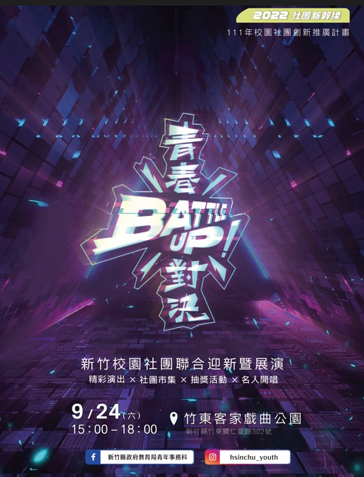 教育局預告,9/24(六)15:00於竹東客家戲曲公園,將熱鬧舉辦今年度第二場社團聯合展演活動《BATTLE UP!青春對決》,當日將邀請35組校園社團齊聚竹東大秀才藝,除了有社團精彩演出及特色市集,現場更將抽出Apple Watch、Switch、AirPods等高價值禮品,還有機會跟青春女神溫妮面對面,歡迎民眾一同蒞臨感受社團魅力!