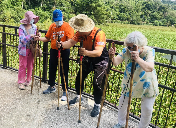 「使用健走杖行走,可以增加支撐點,維持平衡讓腳步更穩」2年前罹患阿茲海默症的高先生,有失智及行動不便情形,此次與太太一起參加「農趣健體行」,在郭健中醫生鼓勵下,嘗試使用健行仗,慢慢地跟上大家腳步,開心地說這趟旅程好值得。