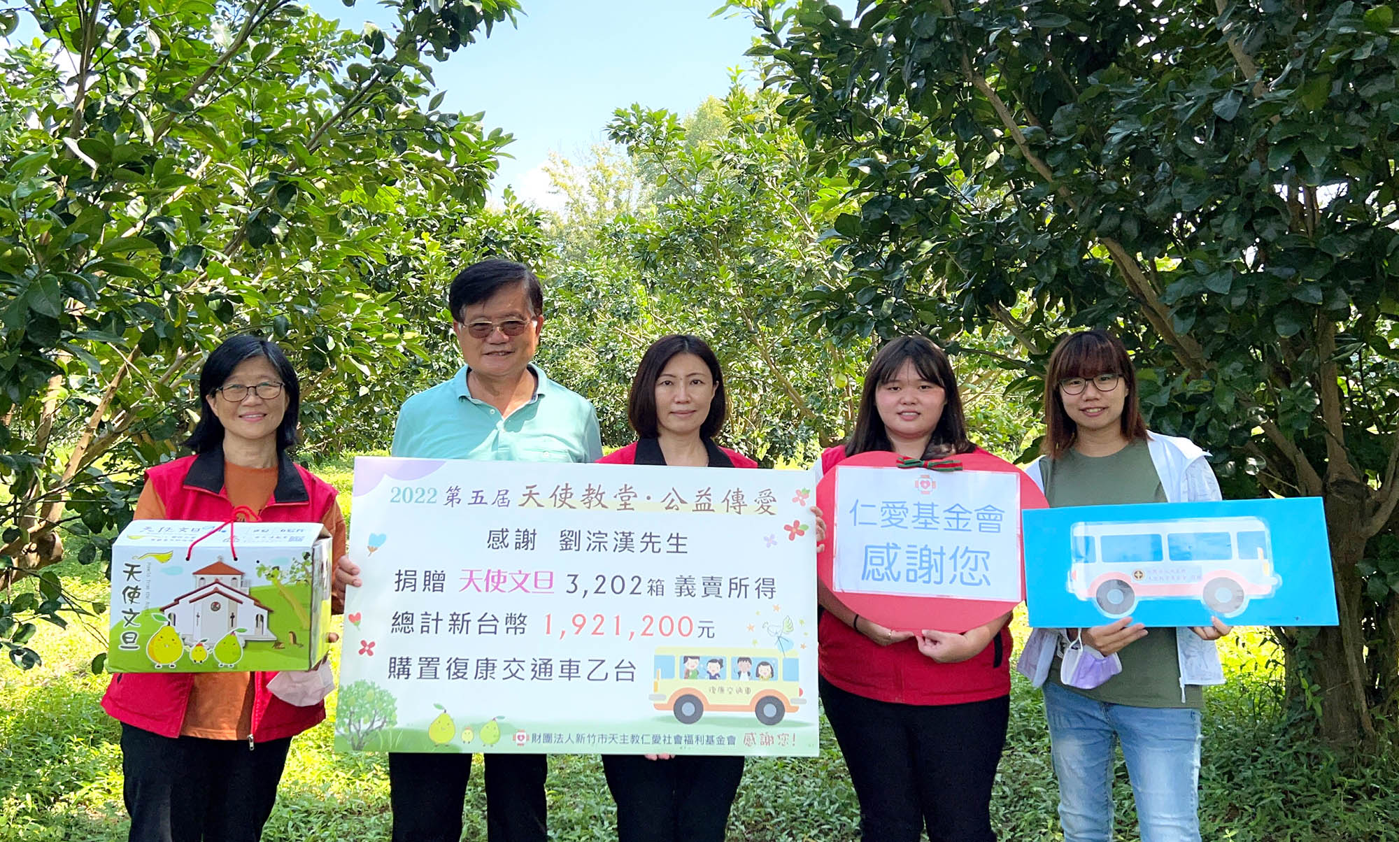 疫情至今尚未平息,新竹市天主教仁愛社會福利基金會募款比去年減少。長期熱心公益、關懷弱勢的劉淙漢於年初得知仁愛正計畫籌募復康交通車經費,因此決定將今年「天使教堂‧公益傳愛」活動的天使文旦義賣所得全數捐贈給仁愛基金會購置一部復康交通車,作為行動不便的身心障礙者參與社區活動使用。