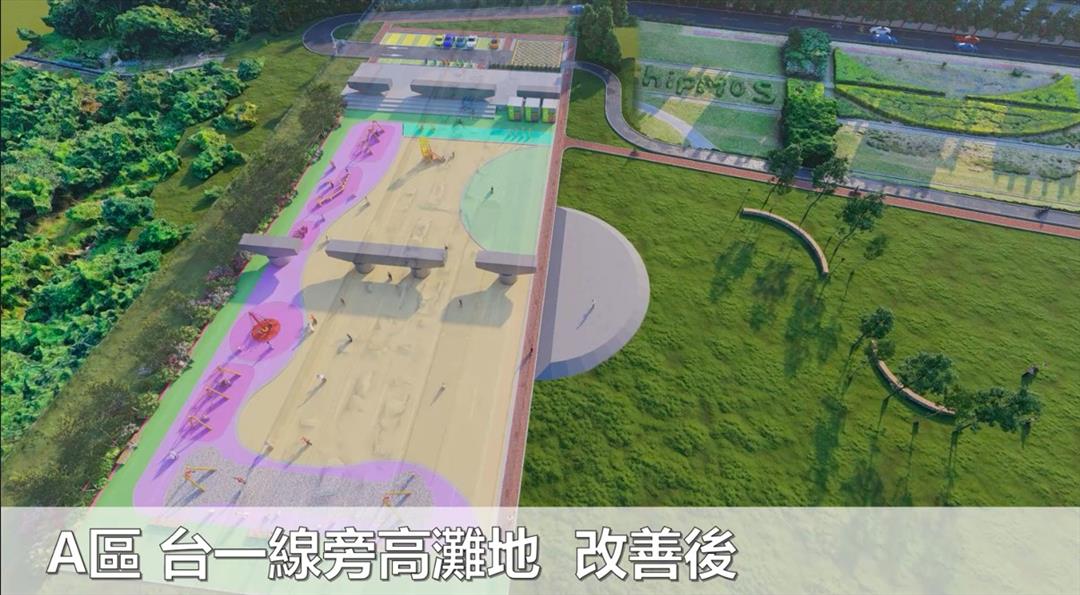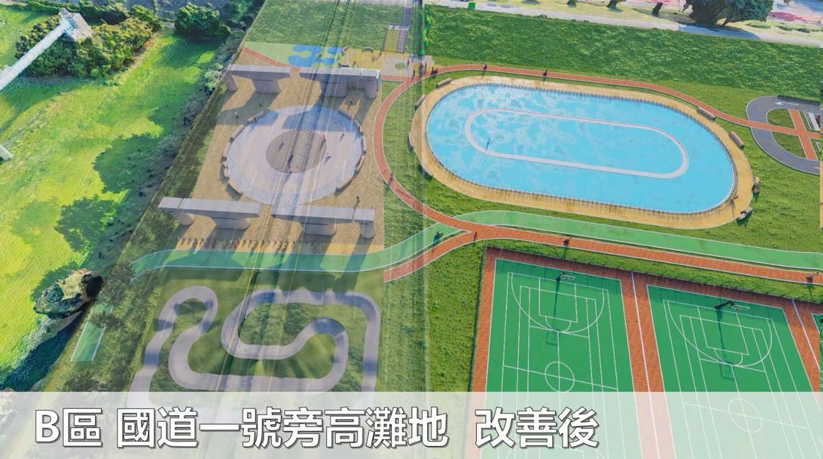 頭前溪北岸高灘地河濱公園先期計畫先期計畫分為A、B區域,優先改善台1線橋下與國道1號橋下空間,新增親子共融式遊戲場、滑輪練習場、綜合球場等運動設施