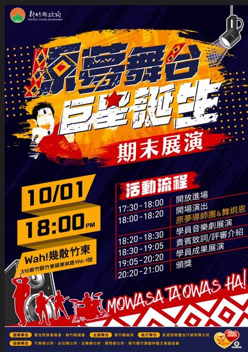 原民處指出,今年新竹縣第二屆「原夢舞台.巨星誕生」期末展演,即將在10月1日晚上6點登場,以「Wah!幾散竹東」為舞台,邀請創作歌手舞炯恩擔任評審,包括第一、第二屆的12位學員,現場將有熱力十足的歌舞表演,還加碼演出歌舞劇,另外還可逛逛美食、文創市集,一次滿足視覺、聽覺和味覺。詳情可上「舞動原鄉.傳唱故事」官方臉書(https://www.facebook.com/atayalsingingdancing) 查詢。