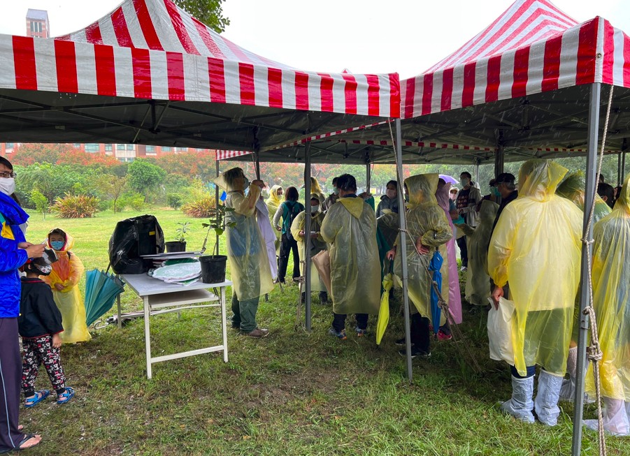 推廣活動今上午在婦幼館公園舉行,即便竹北市從昨晚開始就不停颳風下雨,風雨至今早更無停歇,反倒漸趨強烈,但仍有數十名民眾攜家帶眷,穿著雨衣、踩著爛泥,認真地聽講師解說槲櫟的點點滴滴。