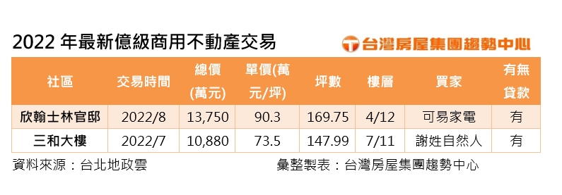 最新實價揭露,一口氣揭露兩筆億級商用不動產,包括士林區豪辦「欣翰士林官邸」,8月成交4樓,總價1億3750萬元、每坪90.3萬元,買家為「可易家電」;中山區南京東路二段「三和大樓」,7樓的前青年旅館「玩客棧旅館」則於7月易主,成交1億880萬元、每坪73.5萬元,共147.99坪,前一手屋主於2014年以1億元買進,這次轉手僅高出買價880萬元,買家為謝姓自然人,該旅館也已於今(26)日正式歇業。