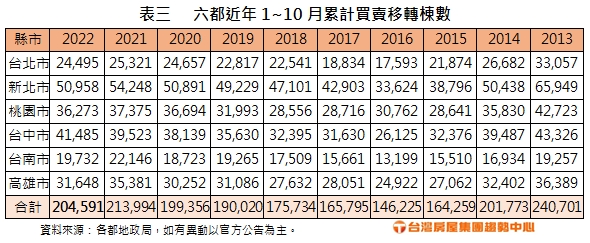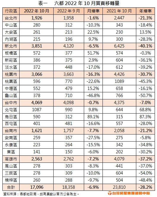 六都今年10月的買賣移轉棟數已揭曉,分別為台北1926棟,月減1.6%,年減21.3%;新北3851棟,月減6.5%,年減40.1%;桃園3066棟,月減16.3%,年減30.7%;台中4069棟,月減0.7%,年減7%;台南1621棟,月減7.7%,年減21.2%;高雄2563棟,月減7.2%,年減37.2%。總計六都今年10月共17096棟,月減6.9%,年減28.2%。