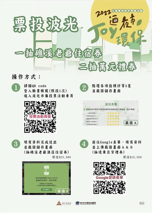 新竹漁港波光市集今(111)年代表竹市角逐行政院環保署辦理的「迺夜市Joy環保」特色環保夜市票選活動,民眾線上參加投票,就有機會獲得五星級住宿券、折疊腳踏車等好禮。陳章賢代理市長宣布,市府再加碼,只要至環保署網站投票「波光市集」並給5星評價,最大獎可抱走1萬元百貨禮券,活動自即日起至11月15日止,歡迎民眾踴躍加入投票行列!