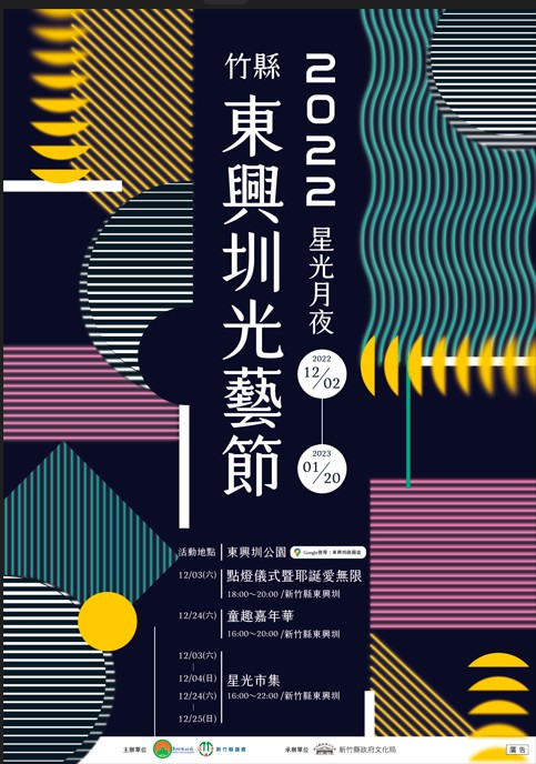 延續去年首屆「東興圳光藝節」熱潮,新竹縣政府文化局將在今年12月2日盛大舉行第二屆「2022東興圳光藝節—星光月夜」,活動場地更較去年擴大4倍,拓展至綠41、公26、公27、公28公園,並以東興圳沿線4座公園空間設計發想藝術裝置。活動展期持續到明年1月20日,縣府將陸續發布相關資訊,邀請民眾今年再度齊聚東興圳光藝節。
