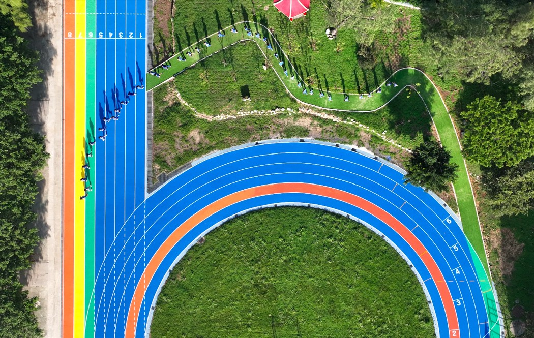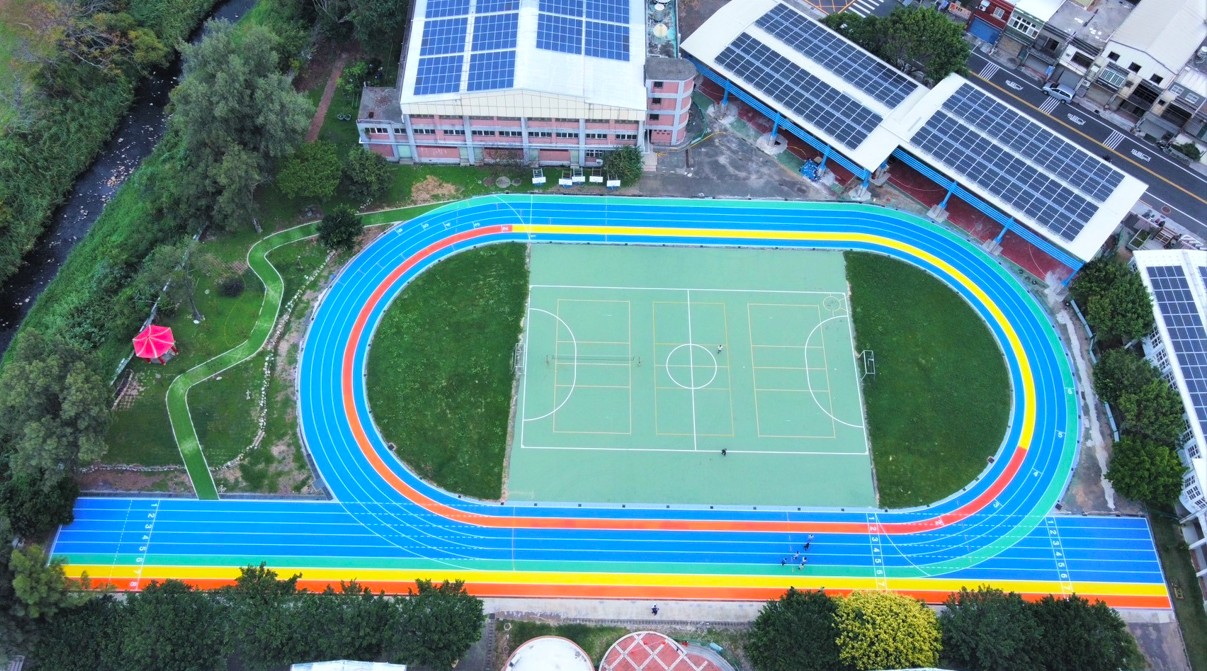 建築師林威政說,透過不同色彩的跑道區分並連接教學場域與運動場域,將教學大樓的暖橘色,連接海洋藍的風雨球場;色彩繽紛的跑道彼此交錯,跑道盡頭延伸操場旁涼亭區步道,映入眼簾的是日本黑松及櫻花樹林,讓跑者彷彿進入「桃花源記」秘境,讓跑步不僅是休閒運動,更是文學與藝術結合的美學饗宴。