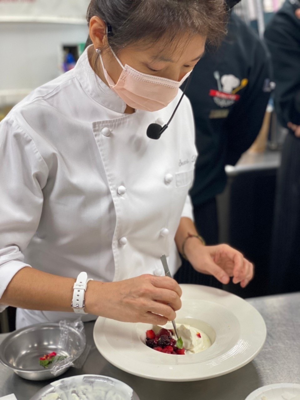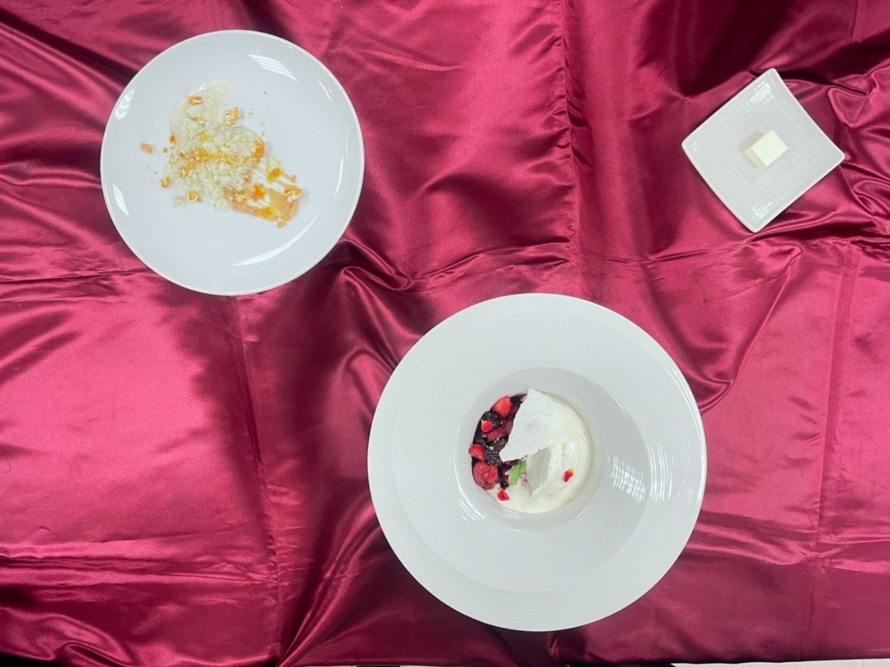 本次林承萱(Seani Lin)師傅蒞校教學,使用的材料包括伊斯尼鮮奶油、馬達加斯加香草莢法芙娜歐帕莉絲白巧克力、片鹽、伊斯尼發酵奶油等內容,製作出鮮美的手工自製瑪斯卡邦乳酪/糖漬莓果/蛋白餅,橙香萊姆酒米布丁/焦糖爆米花/香草冰沙佐蘋果酒焦糖醬汁等幾道甜點。曾在喜來登飯店擔任甜點副主廚的餐飲系老師林宜慧說明,每道甜點入口即融、散發出淡淡的清香,清爽可口、甜而不膩具備層次感,難怪可以成為米其林產品。
