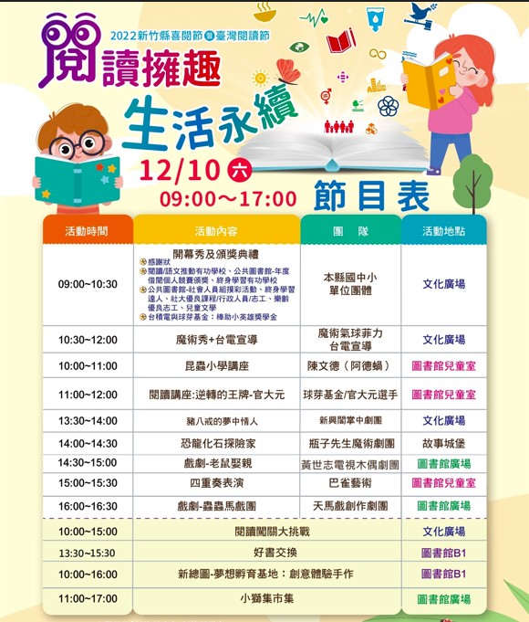 由新竹縣政府文化局及教育局攜手縣內國中小共同辦理的「111年新竹縣閱讀節暨喜閱節」閱讀嘉年華,將於12月10日(六)在文化局熱鬧登場,活動內容包括縣內29所中小學閱讀推動成果展、親子闖關、戲團表演、好書交換、創意DIY等,並有近40攤好吃、好玩又好逛的市集,精彩可期。