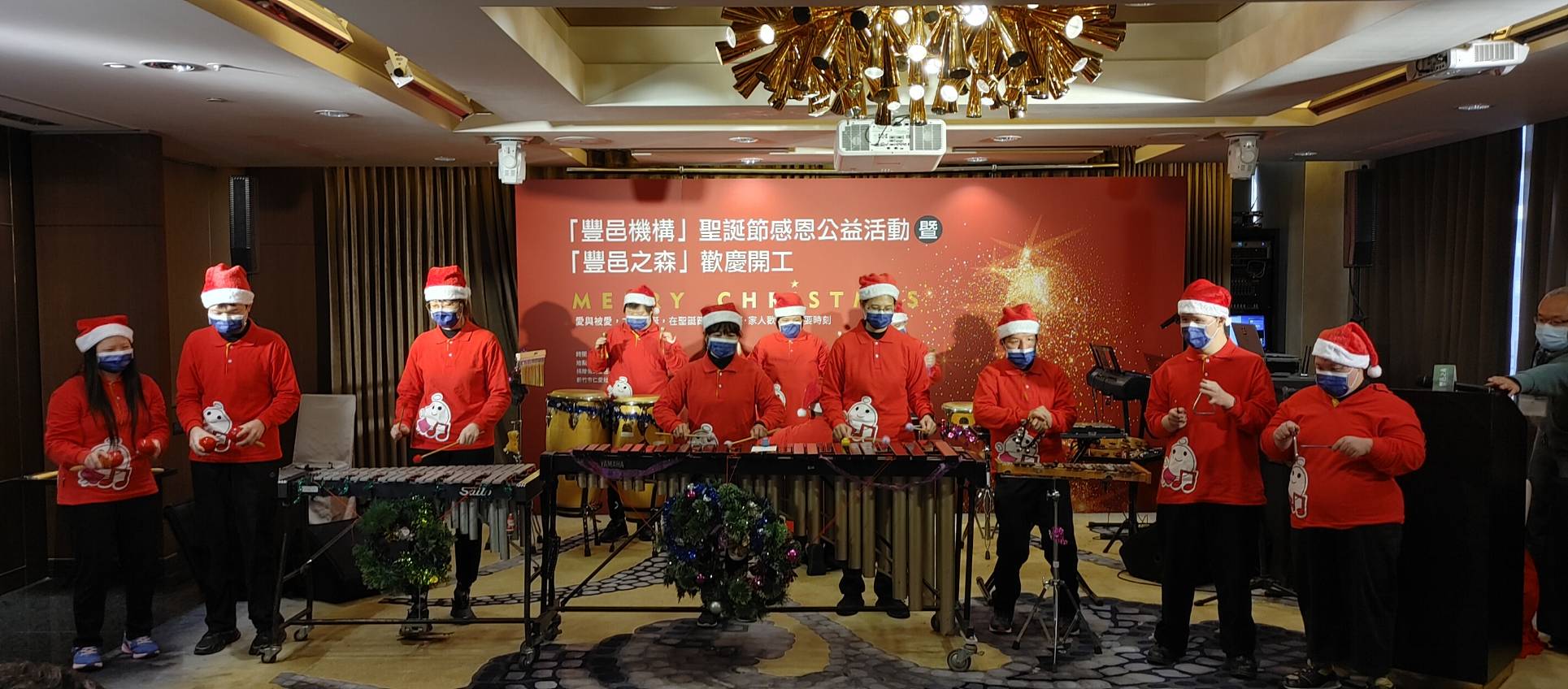 捐贈儀式上,由受贈單位「仁愛基金會」天使打擊樂團的孩子們,演奏《平安夜》、《瑪麗亞的男嬰》、《聖誕鈴聲》組曲,第三首《聖誕鈴聲》邀請嘉賓一同拿起手搖鈴打節奏,帶動現場歡樂的氣氛。