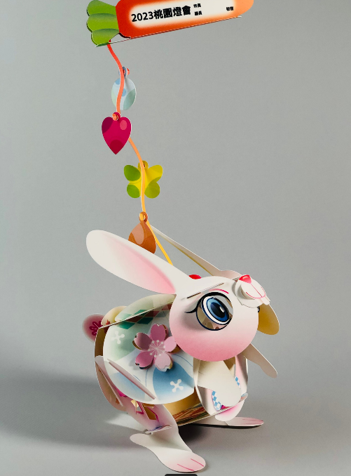 2023桃園兔年創意小提燈「幸福兔」,是由紙雕小提燈原創人「洪新富老師」及桃園在地藝術家「蕭民遠」共同為桃園燈會量身打造。「幸福兔」身體由8個圓形組合片互扣而成,寓意「圓融、圓滿」,身上的圖案則為復興櫻花、客家桐花、石門槭樹、繽紛花彩節等,展現桃園四季花卉意象;小提燈提把則為紅蘿蔔形狀,代表手握好彩頭;提繩上4個配件組成了「幸/福/桃/園」(愛心、蝴蝶、桃子、圓形)。