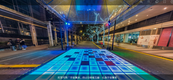 年節期間怎能少了歡樂的節慶元素,在統一時代百貨和誠品信義間的「宇宙舞池」裡,民眾踩著LED地板,原本單調的地面有了燈光變化,搭配BROSMIND授權的圖像互動,與主題燈座「光能使者」相呼應,民眾可使用手機掃描QR CODE與角色共舞、拍照、錄影,每位上台的人都是宇宙等級的舞者。