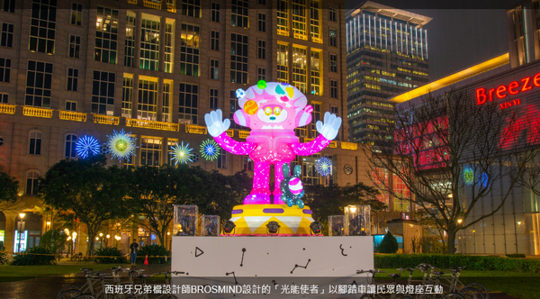 繼日裔藝術家大岩奧斯卡的「光兔現蹤」後,西班牙兄弟檔設計師BORSMIND也接棒為燈會帶來「光能使者」,從宇宙來的他,帶著寵物到達地球散播歡樂與祈福,雙手高舉表示熱情歡迎與招呼,眼睛也因他來到地球學習中文後而有著「你好」的字樣,身上融合地球、宇宙圖樣,腳踩的飛碟是他四處旅行的飛行器,收集人間的夢想帶回宇宙。
