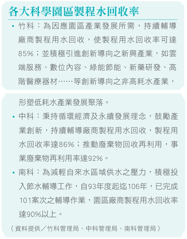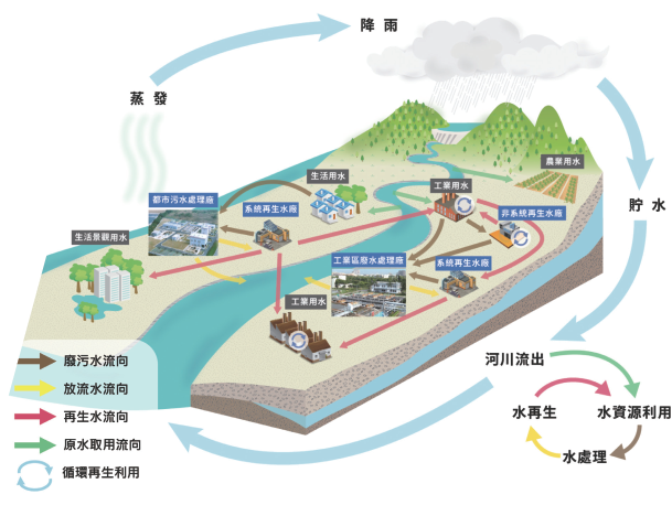 全球因氣候變遷,降雨量本就愈趨減少,而臺灣更因降雨季節分配不均,春、冬季常患缺水危機,特別需要做好水資源的管理與使用,因此政府積極推動再生水的利用,帶頭投資、累積相關實績,並引導產業投入開發,訂定了《再生水資源發展條例》及修正《水利法》,規定用水量達到一定規模以上的工業區開發案,需提送用水計畫,並於審查階段視需要求使用再生水,例如南部科學工業園區臺南園區用水計畫中,將使用8.3萬噸再生水。