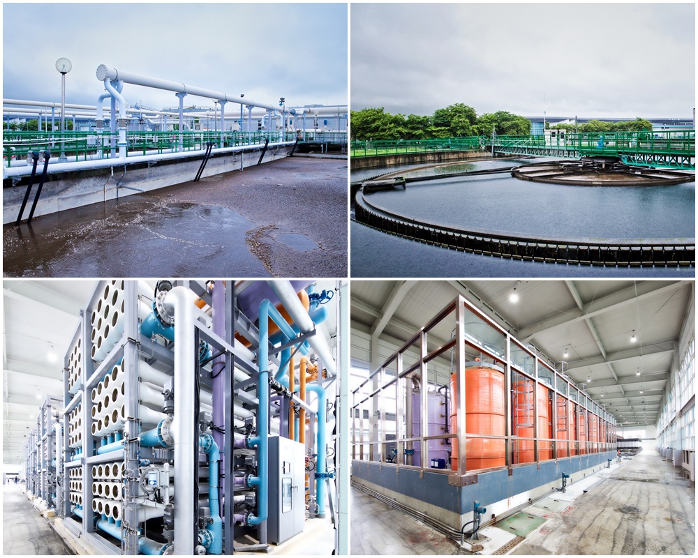 在戶外的汙水設施,左上圖為好氧生物池;右上圖為二級沉澱池;室內的再生水處理設施,左下圖為RO逆滲透再生水回收系統,右下圖為藥槽區,作用在將膜孔上的附著物清洗去除,以降低膜孔阻塞機率,延長薄膜壽命。