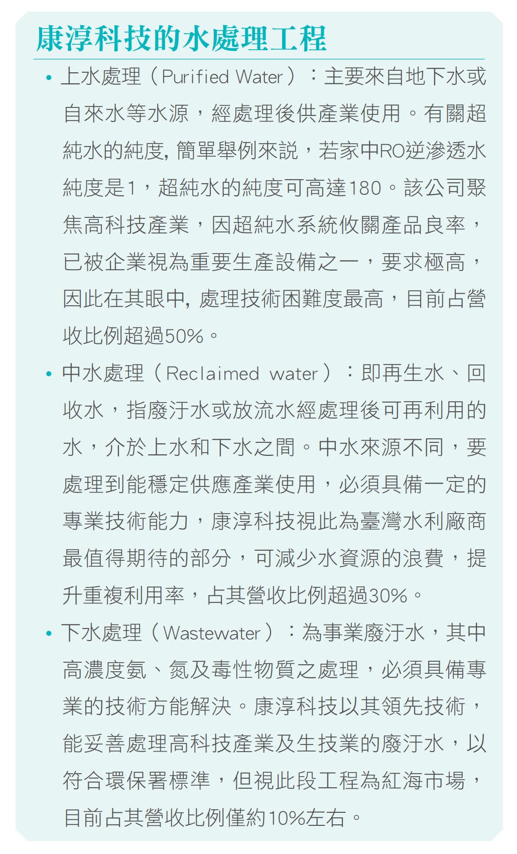 康淳科技以專業水處理工程系統規畫領先業界,擁有自己的研發部門、水質分析實驗室及多項創新技術,從撰寫程式到組裝設備系統一條龍全都自己來,可依客戶需求客製化量身打造產業製程用水和廢汙水回收系統。業務範圍包括超純水、廢水回收、廢水處理工程,從規劃設計、施工、監造到工程完工後之維護保養、耗材更換……,為了更有效開發及利用水資源,該公司也投入各種廢水回收與廢水處理工程的研發,並已自行開發出專屬的物聯網系統,可透過手機遠端監控加上大數據分析,預防性維護,落實風險管理,減少停機維修時間,從而降低營運成本,增加客戶競爭力。林守堂透露,目前正朝向智能化與綠色計畫邁進,研發省水、省電、省藥、省空間及對環境更友善的軟硬體系統與工程技術。