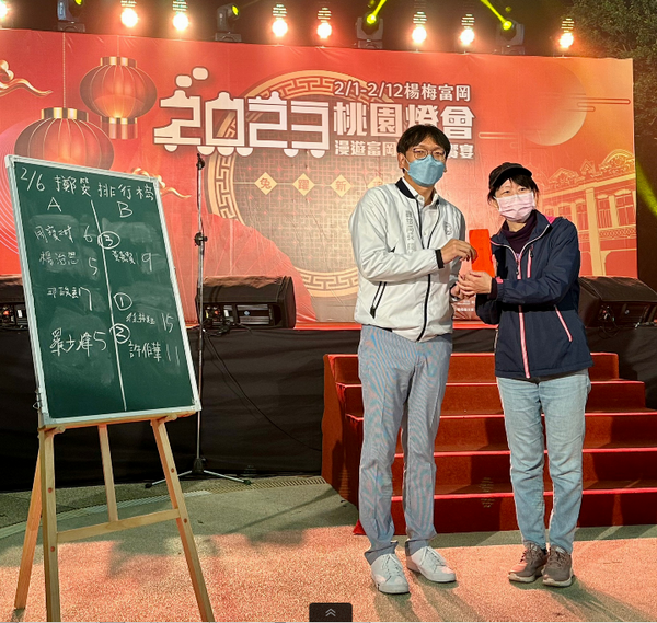 擲筊大賽和疊杯體驗於2/7至2/11日每晚6:30至7:30於伯公岡公園天幕下舉辦,每日限訂100個名額,擲筊最高次數者還可獲得1500元超商禮卷,六天累計最高著獲得Apple Watch Series 8 一只,更是每日秒殺的活動。(照片為觀光旅遊局長周柏吟頒發給連續擲出15個聖筊的幸運民眾)