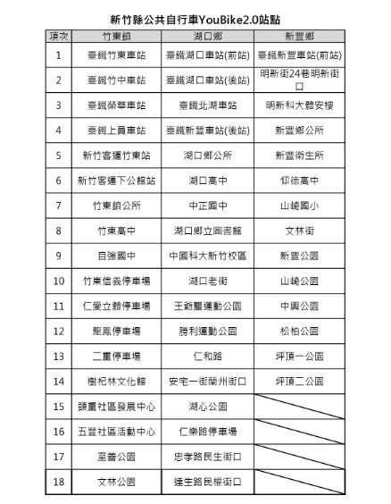 自去年YouBike正式進駐竹北市以來,各地鄉親反應熱烈,縣府也積極推動擴展站點至竹東、新豐、湖口,目前已完成3鄉鎮共50站點會勘並陸續施工,最快將於4月正式啟用3鄉鎮350輛車,未來新竹縣將有101個站點與790輛車提供服務,進一步提升新竹縣公共運輸服務品質。