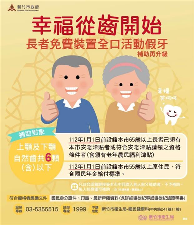 今(112)年起放寬全口活動假牙補助資格,過去為108年1月1日前設籍本市長輩才享有優惠,現在放寬補助條件為112年1月1日前設籍本市長輩(符合新竹市安老津貼給付之資產及居住條件)及55歲以上原住民(符合國民年金條件)裝置全口活動假牙,每位補助最高6萬元。
