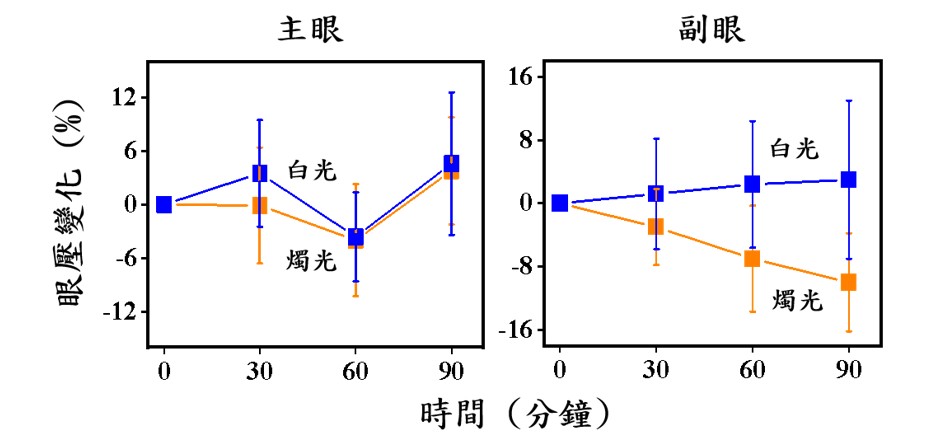 臨床實驗結果顯示,同樣閱讀90分鐘,在燭光環境中,副眼眼壓下降10%,而在白光中,則上升3%;另外,在閱讀期間,主眼出現較明顯的眼壓震盪,使用白光震盪大。