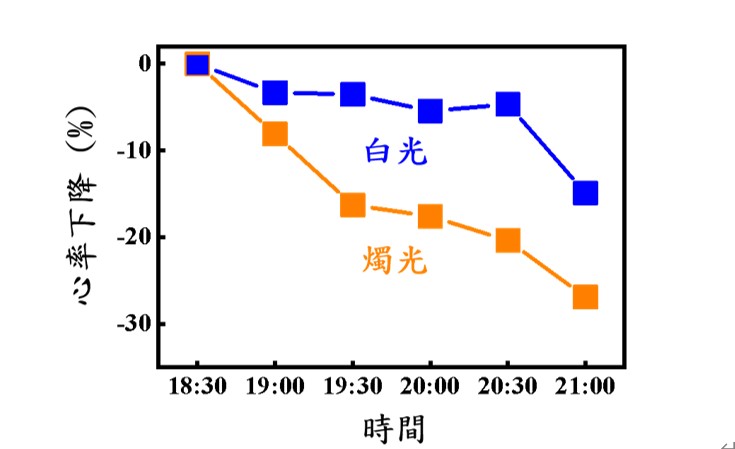 在與台大、曙光女中的共同研究中發現,黃昏後,使用燭光檯燈閱讀,心率會有明顯的降低,「從晚上6至9點,使用燭光閱讀,心率降低20%,而用白光僅降低10%,燭光的降低效果,是白光的2倍。」曙光女中顔瑪函同學指出,人的心率,在晚上,本來就會變慢,但是,白光會有顯著的妨礙,使用燭光,則較有利於入夜的休息。