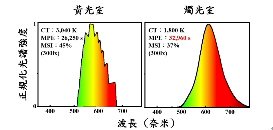 周教授指出,在與力積電的產學合作中發現,燭光可以讓人觀看更久,在同樣亮度下,可觀看時間,由原來黃光的440分鐘,增加到550分鐘,增加25%。