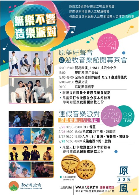新竹縣首座原住民產業展銷中心「WAH!幾散竹東」大獲好評,各類表演活動不間斷,縣府特別協助提升展演廳環境,由營運業者重新命名為「遊牧音樂館」,明(24日)晚5時隆重開幕!開幕茶會將邀請全台最年輕的搖滾樂團J HALL搖滾小小兵及泰雅族創作團體「O.S.T」帶來精彩表演,為228連假4天的原風325原夢好聲音音樂派對暖身,多組原民歌手及團體將輪番上陣熱力開唱,邀請大家來竹東感受原住民音樂的魅力及熱情。