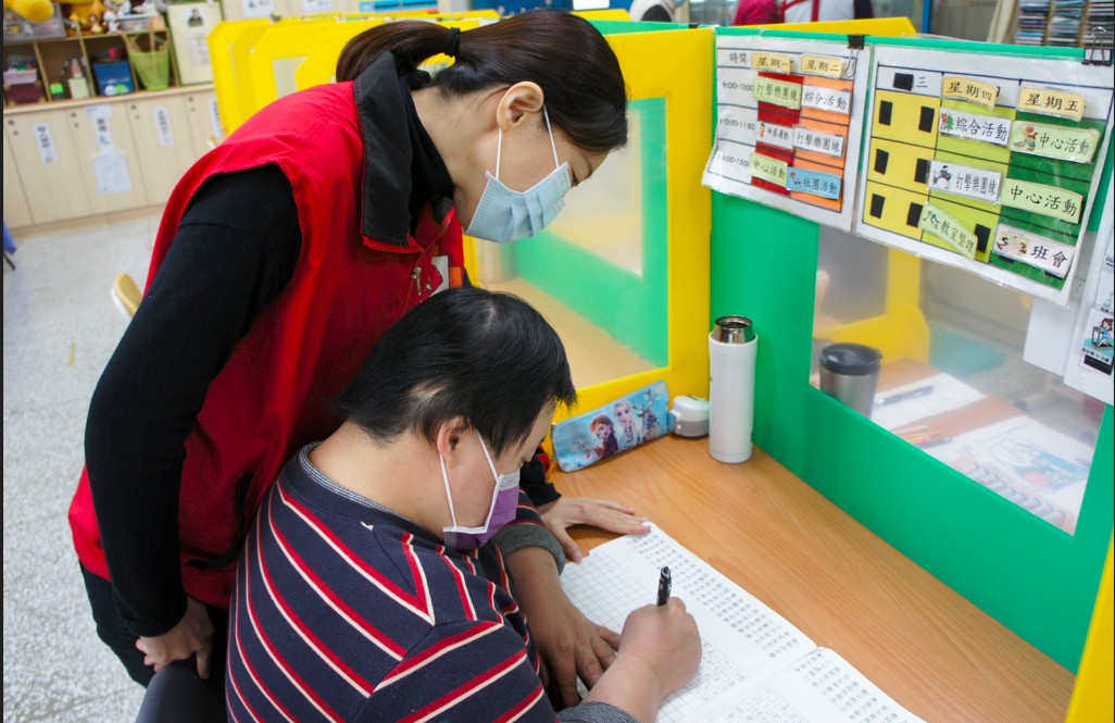 林湘雅執行長(左)陪伴君君(右)寫字。感謝高通捐贈餐食經費,讓服務對象擁有健康的身體,學習上有更好的表現-新竹市天主教仁愛基金會提供
