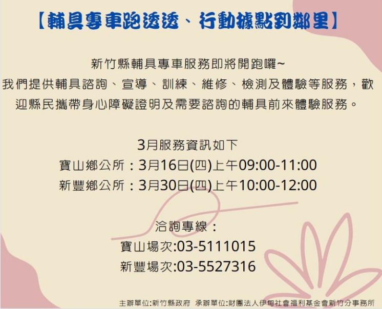 繼年初在竹東鎮新設南區輔具資源中心,新竹縣政府再推輔具服務宅急便,將輔具服務專車開進全縣13鄉鎮市,首波分別在3月16日、30日前往寶山鄉公所、新豐鄉公所,其它鄉鎮也會一一跑透透。新竹縣長楊文科表示,輔具維修保養後更耐用、更安心,歡迎長者、身障朋友、轄內身障團體、特教學校多多利用。