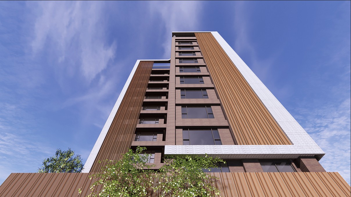 為了給住戶最佳的採光,採成本最高的「品」字形外觀建築設計,分A、B、C三棟,戶與戶之間沒有共同的牆壁,建築立面以淺灰和深色磚搭配,成就乾淨、成熟與質感的外觀;突破單一色系的格柵設計, 透過三色深淺的跳色格柵,展現建物的風格與調性, 格柵不僅是美觀的追求、風格的塑造,也是重視住戶隱私的設計,在主臥外格柵出一方定靜與距離感。