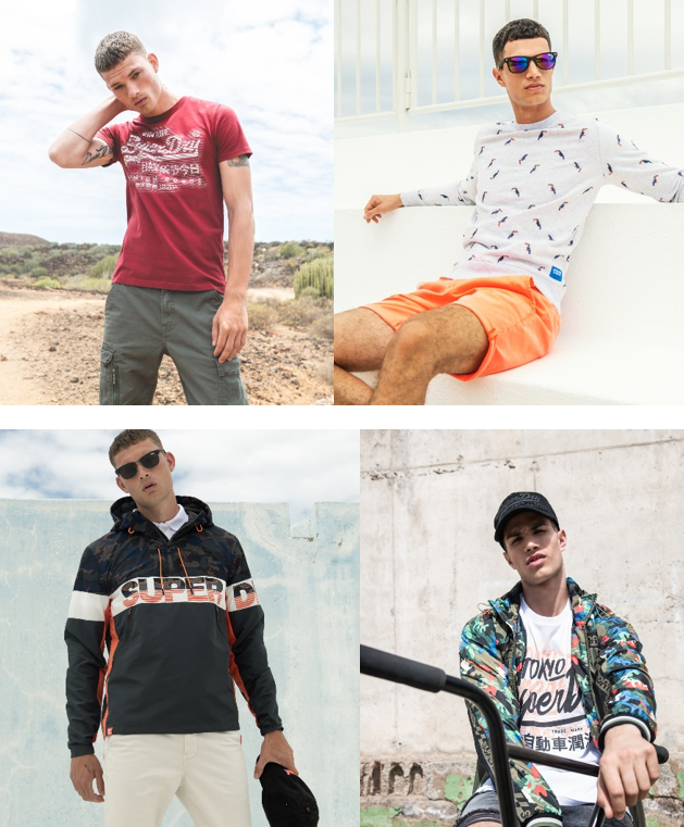 本季在男性服飾部分Superdry設計團隊打造四大系列,每一系列透過獨特的圖樣與色彩設計定義其主題。「加州蘇爾海岸」由北美加州海岸為依據的美式風格,以大地色、迷彩為主進行設計的休閒和工作服飾。「海洋探險系列」營造一種熱帶海洋冒險的氛圍,大量運用由1930年代旅遊海報為設計基礎的夏威夷圖騰以及佛羅里達風格的色彩。「Nu Lad」英倫休閒時尚男性的代名詞,此一系列最大特色以色塊搭配經典LOGO進行設計,打造現代感十足的休閒運動風。「滑板街頭」系列向90年代的滑板時尚和街頭潮流致敬,黑色是這一系列的王道,合身T-shirt和配飾搭上經典LOGO的排列組合或是類迷彩的圖騰設計。無論你是哪個風格的男孩,本季Superdry都能讓你的時尚風格新意十足。