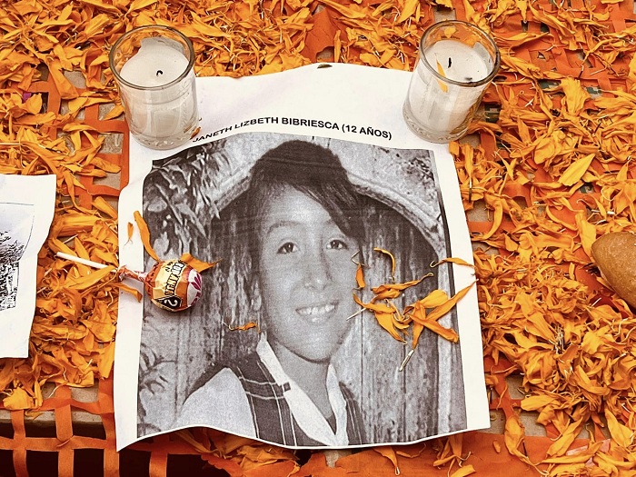 國家宮廣場的亡靈節祭壇上,擺放一幅青春揚溢的青少年照片,令人不捨!