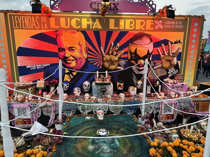 墨西哥國家宮(總統府)前廣場,每年都會舉辦亡靈節展覽活動,豎立二十座大型人偶的公共藝術,每個約四公尺高,相當壯觀。而且設立非常多的祭壇,甚至把現任總統都放在祭壇上的黑色幽默,顯示墨西哥是容忍度高的民主國家。