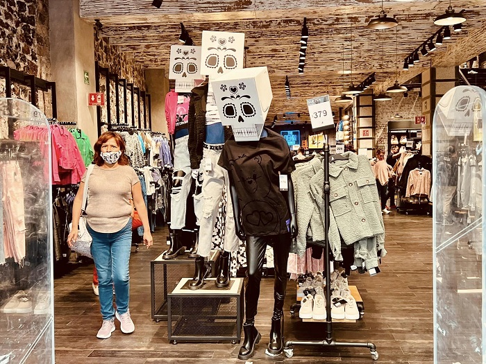 滿街都在籌備和展示亡靈節活動,連服裝店都不免俗的,用骷髏人造型設計成黑色幽默。