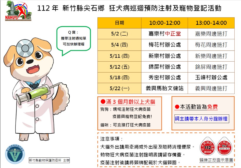 新竹縣動物保護防疫所為防範狂犬病,維護公共衛生及民眾生命安全,每年辦理各鄉鎮市狂犬病預防注射及寵物登記巡迴活動,5月在尖石鄉辦理6場,活動皆為免費,明天(2日)首場在嘉樂村中正堂開打,歡迎飼主帶著毛小孩前往施打。