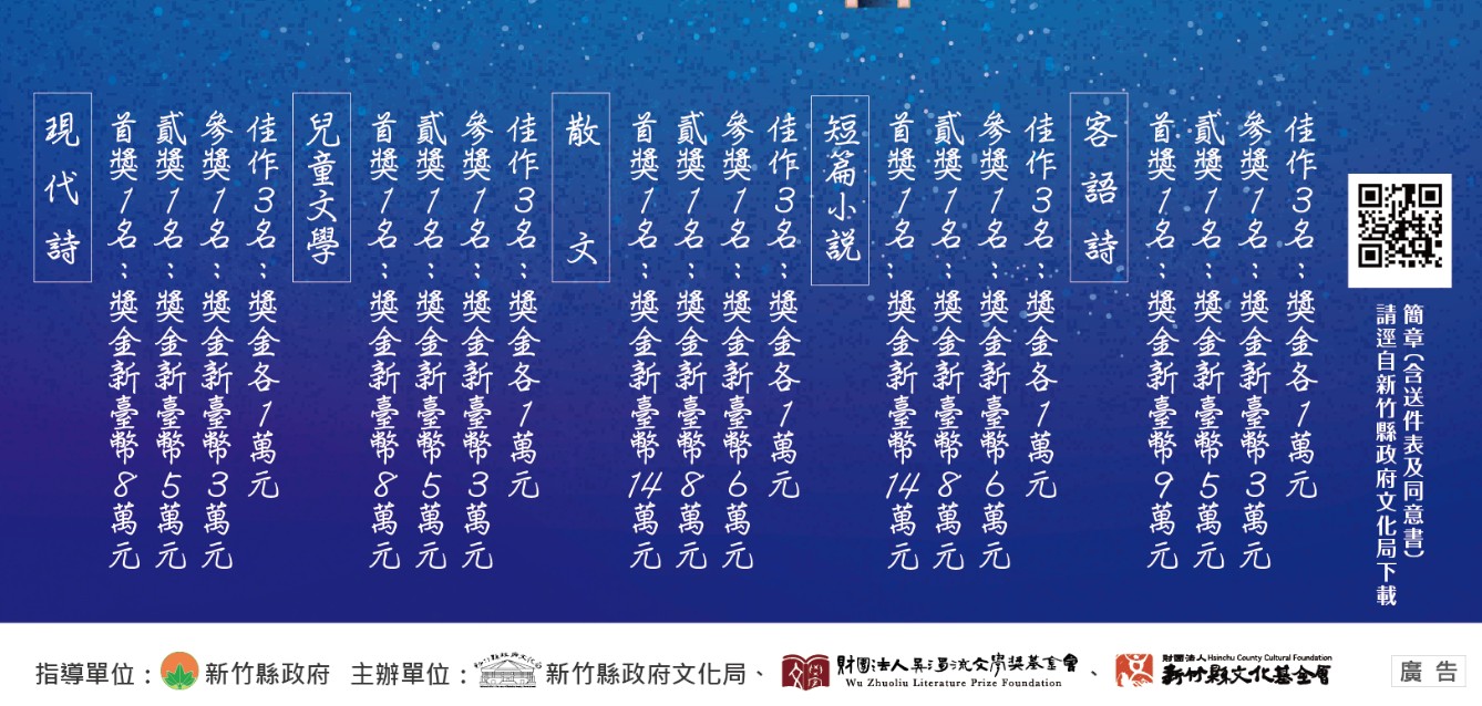 新竹縣年度盛事「2023年吳濁流文學獎」徵文活動開始,徵文類別共有現代詩、兒童文學、散文、短篇小說及客語詩五大類,總獎金高達120萬元,即日起開放收件至7月20日止,歡迎愛好文學創作的您,踴躍參加!