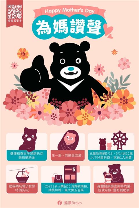 週末就是母親節,臺北市政府觀光傳播局表示,「Humans of Taipei 我是台北人 」 FB粉絲專頁為不同需求的媽媽整理相關政策及活動資訊,包括孕前檢查補助、生育獎勵金、健康檢查補助、兒童新樂園優惠及貓空電子套票等,其中北市府「Let's購台北」活動為感謝全天下母親,即日起至5月31日持續消費登錄「消費歡樂抽」,不僅週週抽黃金、iPhone14 ,總抽更有高級汽車、頭獎五百萬等,5月14日母親節當日前之消費登錄,還加碼「母親節感恩抽」,有機會獲得元氣能量椅等總價值近55萬元獎品。