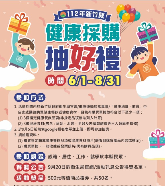為推廣均衡及健康飲食觀念,新竹縣政府衛生局統整13鄉鎮市的健康食材通路及店家,建置新竹縣健康飲食地圖,讓鄉親聰明選、健康吃,為擴大宣導鼓勵鄉親參與,從6月1日至8月31日舉辦「健康採購抽好禮」活動,期望鼓勵外食族能選擇健康餐飲,營造健康飲食環境、落實健康飲食觀念。