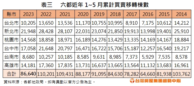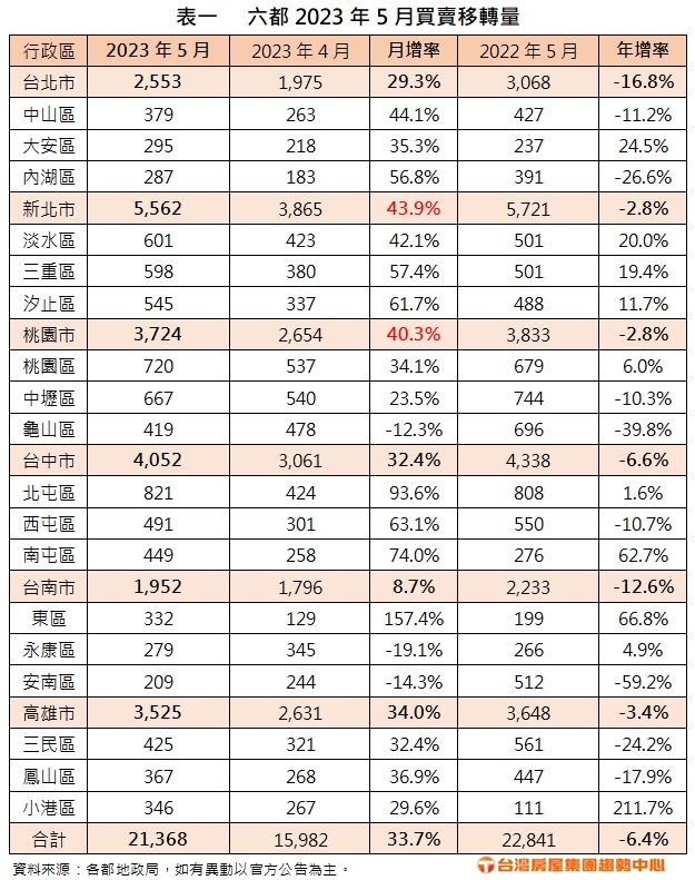 六都今年5月的買賣移轉棟數已揭曉!分別是台北2,553棟,月增29.3%,年減16.8%;新北5,562棟,月增43.9,年減2.8%;桃園3,724棟,月增40.3%,年減2.8%;台中4,052棟,月增32.4%,年減6.6%;台南1,952棟,月增8.7%,年減12.6%;高雄3,525棟,月增34%,年減3.4%;六都合計共21,368棟,月增33.7%,年減6.4%。