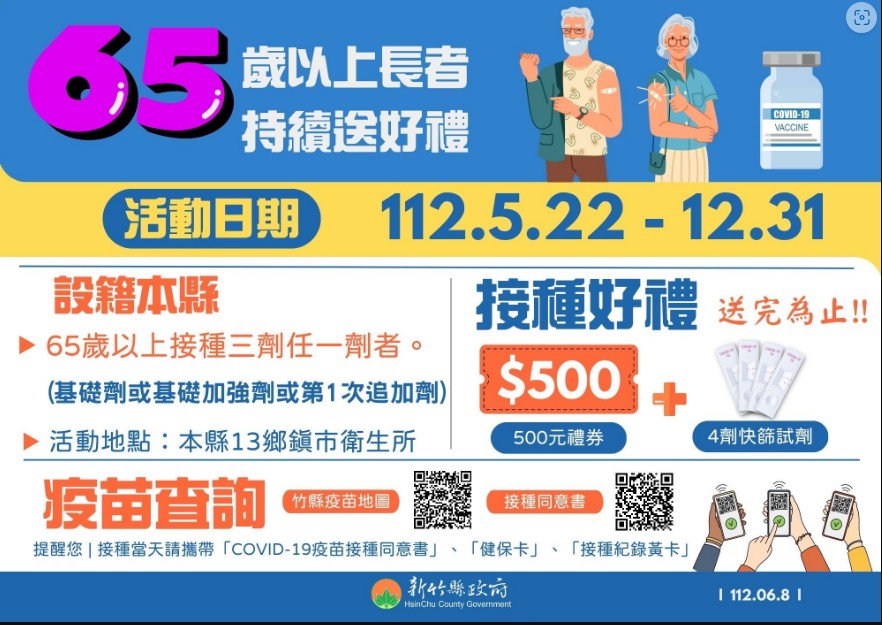 由於近日全國COVID-19疫情有上升趨勢,新竹縣政府衛生局為鼓勵鄉親盡速完成疫苗接種,只要是設籍本縣、出生滿六個月以上且今年尚未接種過疫苗者,及設籍本縣65歲以上且未完成接種3劑者,即日起接種疫苗即可獲贈500元商品禮券與4劑快篩試劑,數量有限,送完為止。本週六(17日)縣內13鄉鎮市衛生所開設COVID-19疫苗接種專案,隨到隨打,請鄉親多加利用。