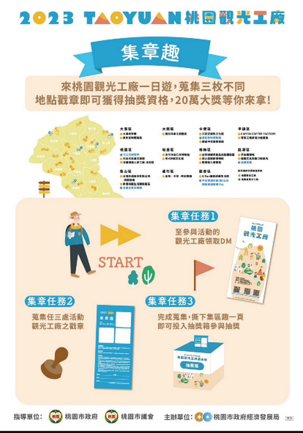 桃園市政府經發局也進駐攤位,帶領觀光工廠以集體聯合行銷方式,突顯各廠特色產業與文化,現場透過VR體驗、手作活動加深民眾對觀光工廠的認識,10月31日前民眾只要到桃園3家不同的觀光工廠完成指定集章任務獲得戳章後,即可獲得全台首推的觀光工廠限定電子購物金20萬元與相關豐富好禮的抽獎資格!配合集章活動的觀光工廠包含郭元益糕餅博物館、祥儀機器人夢工廠、卡司‧蒂菈樂園、台灣菸酒公司桃園酒廠、南僑桃園觀光體驗工廠、老K舒眠文化館、雅聞魅力博物館、東和音樂體驗館、大溪老茶廠、太平洋自行車博物館、江記豆腐乳文化館、CAFE!N、GFun機能紡織生活館、葡萄王健康活力能量館、自然接觸保養品亮點體驗園、雄獅文具想像力製造所、利百代彩筆文創館、勝昌中草藥探索館、手信霧隱城、國巨洋傘文創園區、可口可樂世界、台塑企業文物館、黑松飲料博物館、中台環境資源教育中心、福源茶廠。