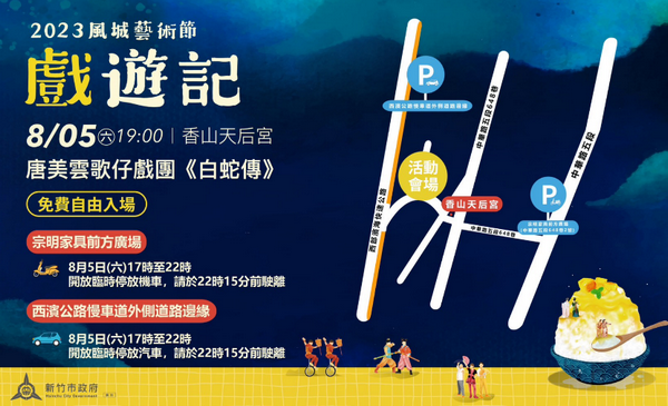 2023風城藝術節第三場演出,將於8月5日(六)晚間7時在香山天后宮盛大開演,邀請唐美雲歌仔戲團演出浪漫民間傳奇《白蛇傳》,由「國家文藝獎得主」唐美雲、「人間國寶」小咪等知名演員,帶領中青代演員一同演出,從既有的人物故事出發,在保留經典橋段前提下,重新改編後開啟一段全新的探索,透過「老戲新唱」重新詮釋經典戲曲。市長高虹安表示,節目開演前還有捐發票換好禮、超夯公仔扭蛋兌換活動,邀大小朋友共度美好週末夜晚。