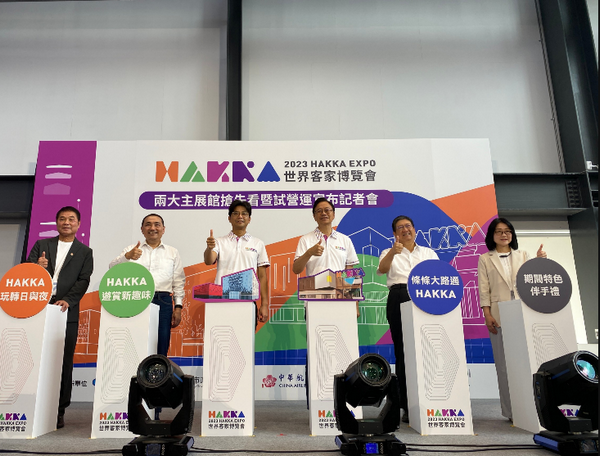 「2023世界客家博覽會」由桃園市政府主辦,8月8日起展開試營運!博覽會共分為「台灣館」、「世界館」2大主展區,與8個副展館,主副展區位於桃園青埔A17-A19站,8月11日正式開展,展期至10月15日。今(4)日舉辦2大主展館搶先看暨試營運宣布記者會,客家委員會副主委周江杰、新竹市副市長蔡麗清、桃園市長張善政、新北市長侯友宜、新竹縣長楊文科及苗栗縣長鍾東錦共同為博覽會揭開序幕,邀請各界踴躍觀展,體驗從地方到世界、傳統到創新的嶄新客家風貌。