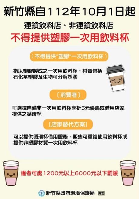 新竹縣配合環保署擴大執行限塑政策,轄內飲料店將自今年10月1日起,不得提供塑膠一次用飲料杯,改以非塑膠材質一次用飲料杯、循環杯借用服務或販售可重複使用飲料杯,縣府環保局將不定期稽查,違規者將依廢棄物清理法第51條第3項規定告發,最高可處6000元罰緩,並得按次連續處分,期望業者善盡保護環境責任,加速源頭減塑。