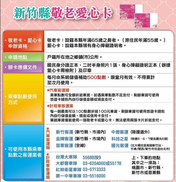 社會處指出, 新竹縣政府的敬老愛心卡,補助新竹縣65 歲以上老人、55 歲以上原住民及領有身心障礙證明者搭乘客運、計程車及台鐵,每月核發補助上限為500元,限當月使用,不得累計至下個月,歡迎符合資格的民眾多多利用。
