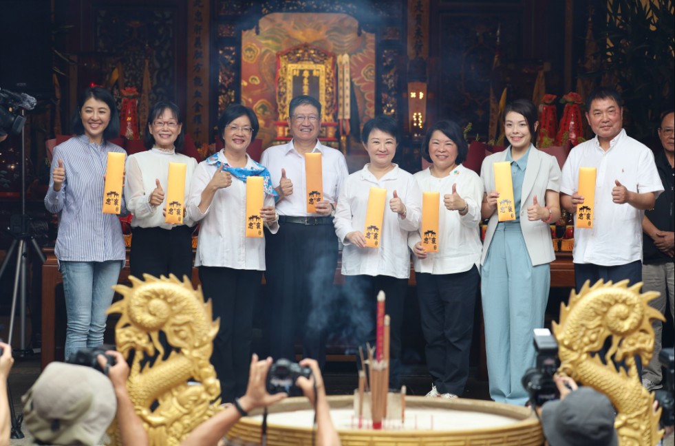 接著由八縣市首長挑起各縣市特色「商圈特產」,參與「擔擔相傳.代代傳」的挑擔祈福儀式,步行至廟前廣場,最後楊縣長及中臺灣首長、義民廟董事長林光華、五分埔祭典區總爐主陳世偉等人,一同上香向義民爺祈福,祈求國泰民安、風調雨順;楊縣長也致贈義民文創品平安符給七縣市首長,感謝大家一同共襄盛舉。